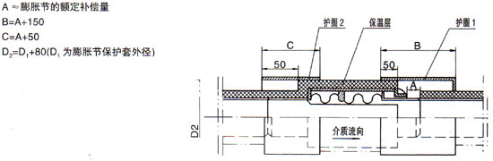 安裝直埋式膨脹節(jié)(不包括一次性直埋式)安裝時應(yīng)有兩個后年度護(hù)圈(如下圖),且護(hù)圈的壁厚不應(yīng)小于管道的壁厚,設(shè)置護(hù)圈1的目的是為管道受熱膨脹時,A尺寸范圍內(nèi)有土、砂等進(jìn)入,圖中的各尺寸
